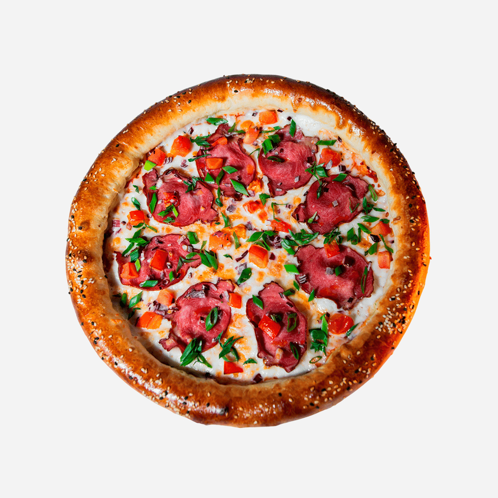 Сыр "Моцарелла", сырный бортик, копчёная конина, лук красный, помидоры, кунжут, зелёный лук