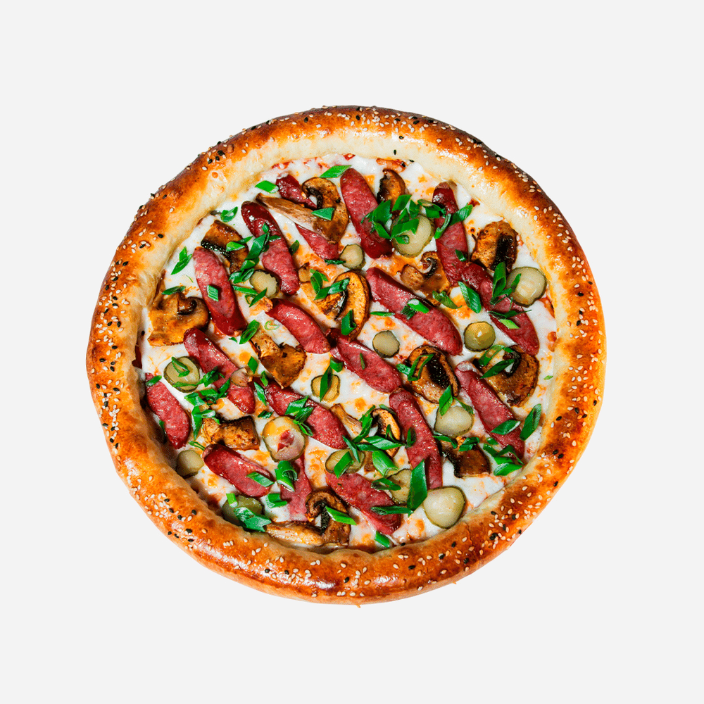 Сыр "Моцарелла", сырный бортик, охотничьи колбаски халал, шампиньоны, корнишоны, кунжут, зелёный лук