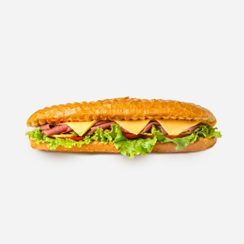Копченая говядина, помидоры, перец болгарский, лист салата, фирменный соус, cыр "Hochland", кабачок, фирменная булочка