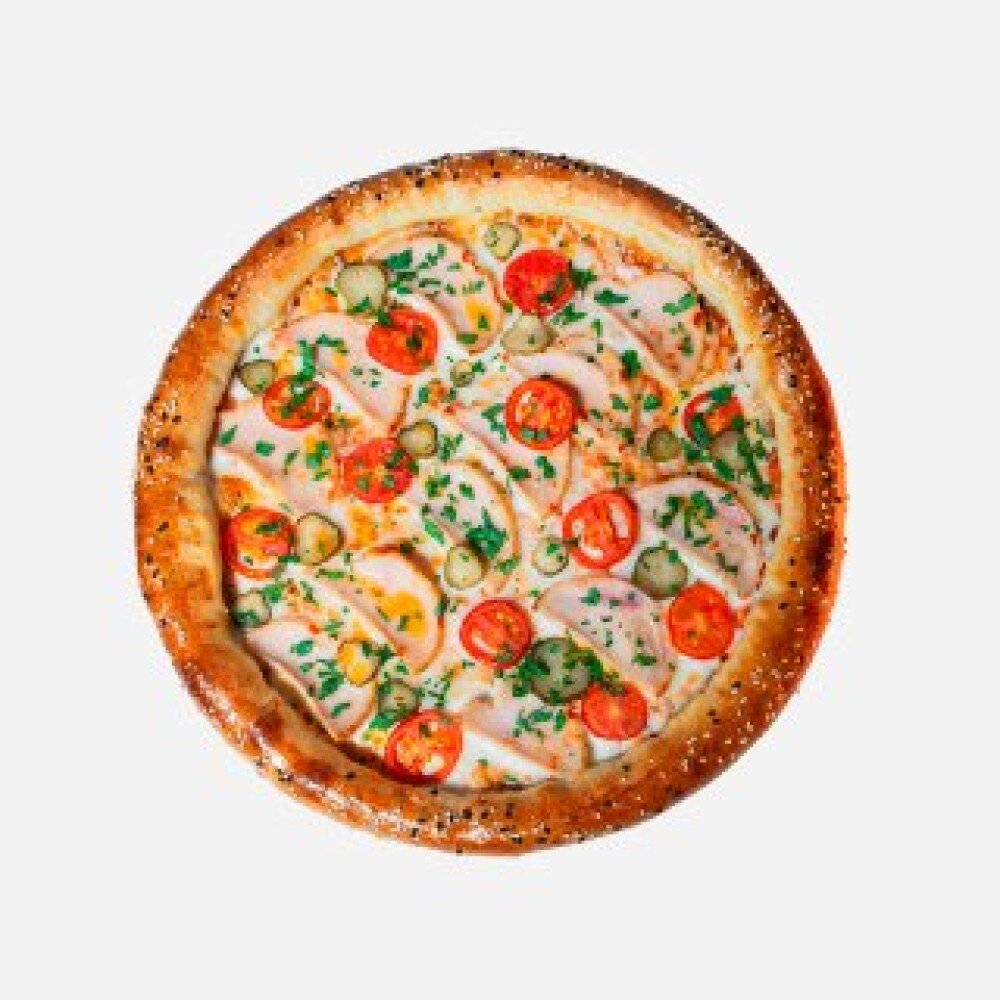 Сыр "Моцарелла", мясной бортик, черри, копченый куриный рулет, корнишоны, кунжут, зелень