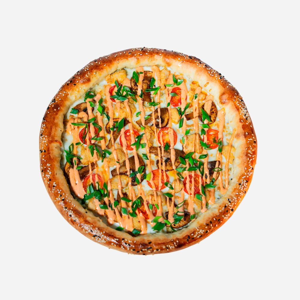 Сыр "Моцарелла", сырный бортик, куриные байтсы, шампиньоны, черри, кунжут, соус Спайси, зелёный лук