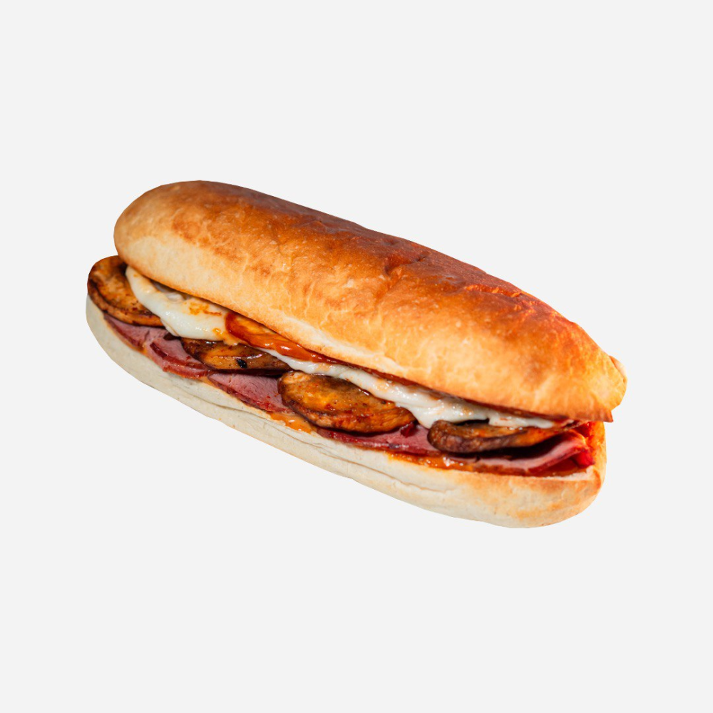 Копчёная конина, шампиньоны, сыр "Моцарелла", фирменный соус, батон