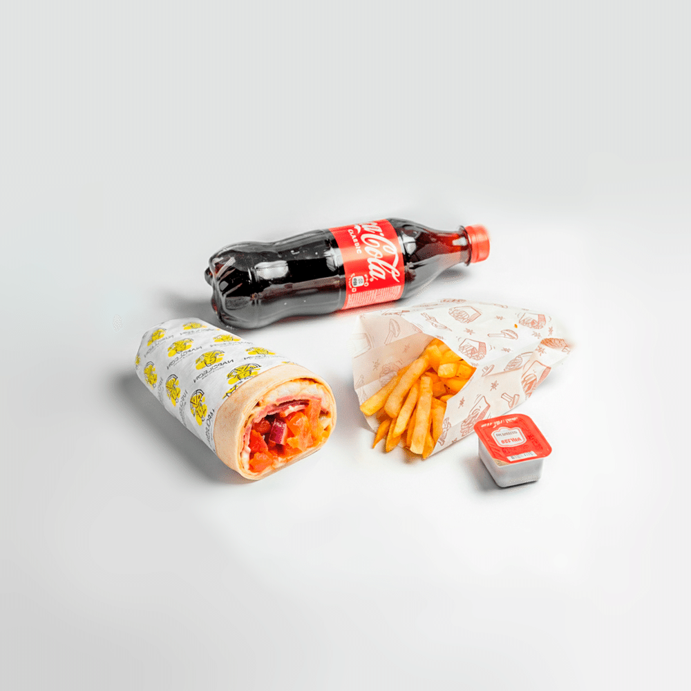Ролл с копчёной кониной, картофель фри, соус, Coca- Сola 0.5L